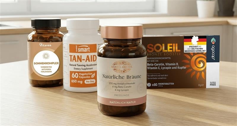 Ein gutes Produkt sollte nicht nur Beta-Carotin enthalten, sondern eine synergistische Kombination aus Beta-Carotin, Lycopin und Lutein. Diese Carotinoide wirken zusammen stärker als einzeln und unterstützen sowohl die optische Bräunung als auch den Hautschutz.