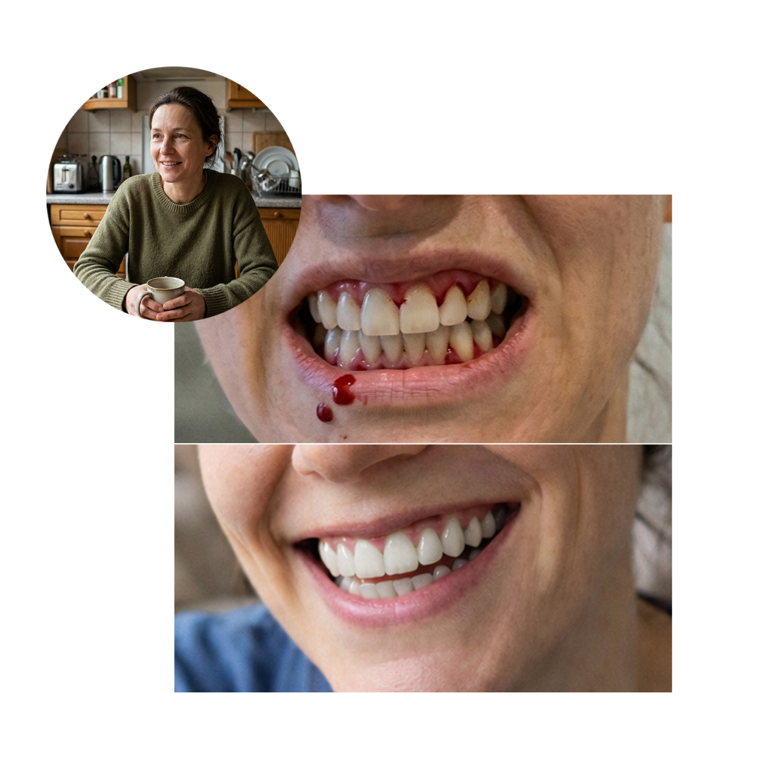 Dann erzählte mir eine Freundin von diesem neuen Produkt auf dem Markt, das einen völlig neuen Ansatz verfolgt, also probierte ich es aus. Ehrlich gesagt, es fühlte sich fast zu einfach an. Doch innerhalb weniger Wochen hörte die Blutung auf, mein Zahnfleisch sah gesünder aus und die Schmerzen verschwanden. Und dann sagte mir mein Zahnarzt, meine Zähne seien wieder stabil. Die Erleichterung war überwältigend. Es fühlte sich an, als hätte ich mein Lächeln und mein Selbstvertrauen zurückgewonnen.